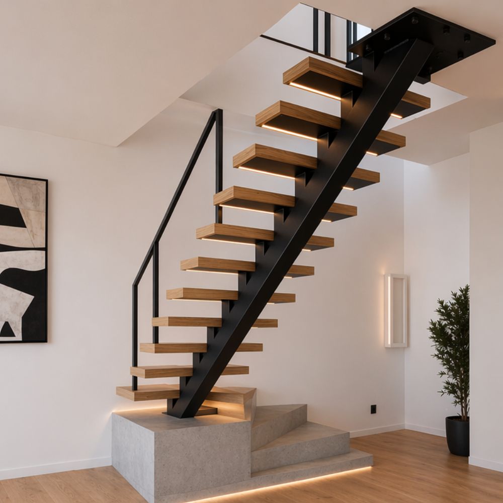 W tym modelu konstrukcja jest bardziej obecna wizualnie niż w lżejszych wariantach belkowych. Dzięki temu schody budują mocniejszy rytm we wnętrzu i dobrze łączą się z drewnem, stalą oraz prostą balustradą. Całość można uzupełnić o oświetlenie LED oraz dobrać balustradę ze szkła lub metalu, zależnie od oczekiwanego efektu końcoweg